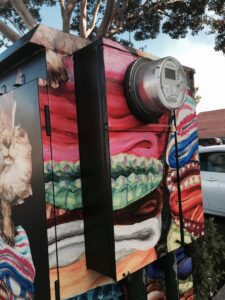 Art as part of daily life is a wonderful pleasure. I live in a community with a surplus of funds that they often devote to sponsoring new pieces of civic art. Most of it isn’t bad, and it’s a joy to browse a small town center full of sculptures and wall murals on a warm spring day. Art in museums is all well and good, but few see that art. This art, simpler and less exalted, can be seen on mechanical boxes and exterior walls, in parks and in plazas. We have towering sculptures in the city park and paintings on mechanical boxes. Where in some places graffiti artists skulk around at night to create, Walnut Creek invites locals to graffiti boarded-up storefronts with messages of unity and cheer.